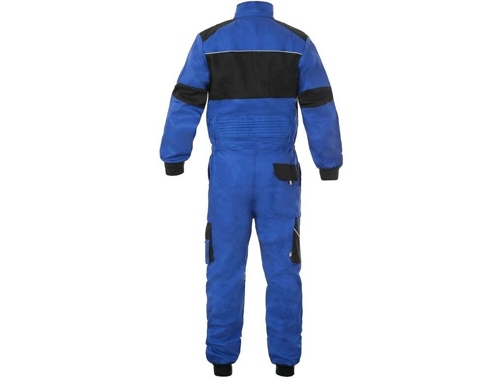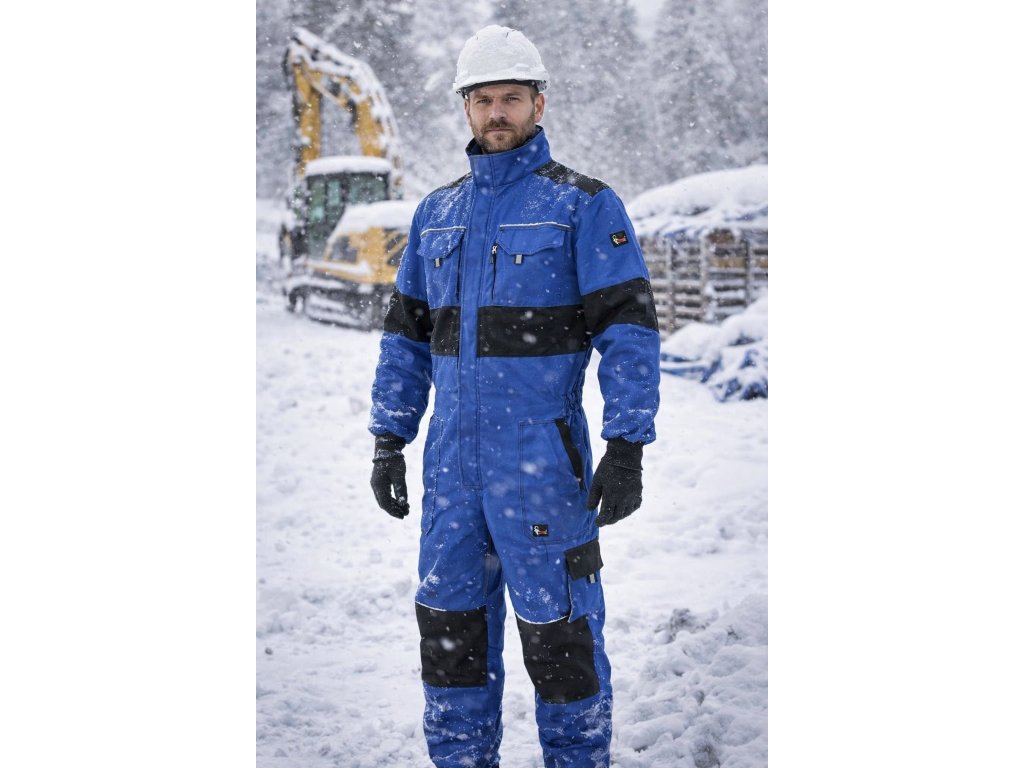 Pánská montérková kombinéza, zateplená výplní z dutého vlákna, kryté zapínání na zip a suché zipy, dvoucestný zip, rukávy s pružnou manžetou, náprsní kapsy s klopami, skrytá náprsní kapsa na zip, přední kapsy, boční kapsa na svinovací / skládací metr, boční kapsa na mobil / peněženku, zdvojená kolena, pruženka v bederní části, zadní kapsa s klopou, reflexní doplňky.