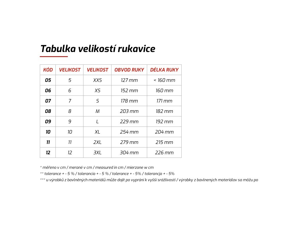 | Materiálové složení | hřbet bavlněný úplet, suchý zip na zápěstí, dlaň kozinková lícovka |