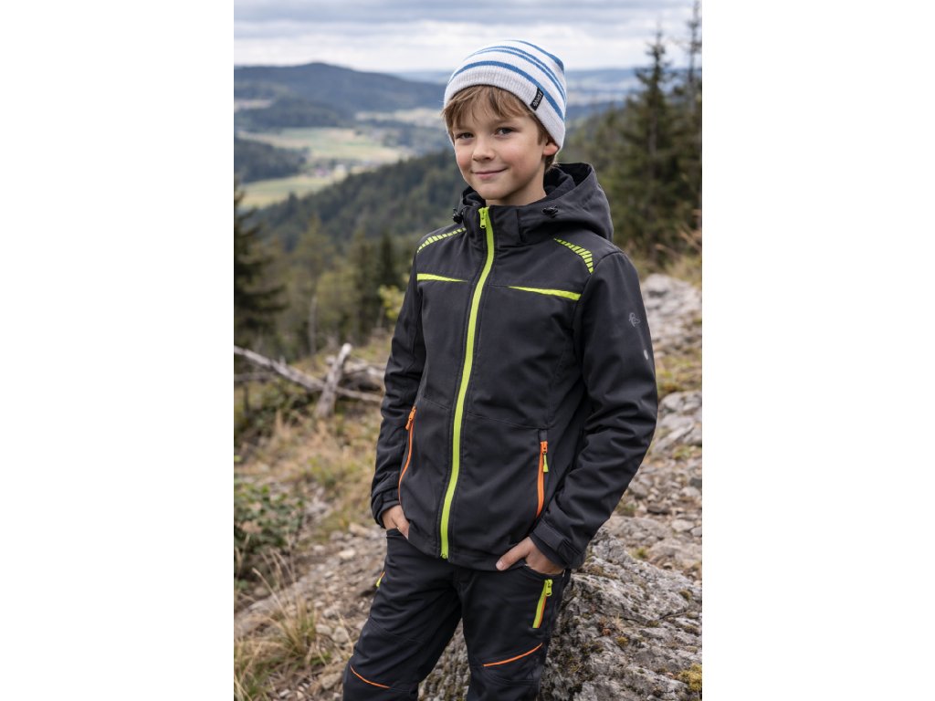 Dětská softshellová bunda s odepínací kapucí, odolná proti vodě a větru, zapínaní na zip, boční kapsy na zip, vnitřní manžety v rukávech, stahování v dolním okraji, reflexní doplňky, TPU membrána.