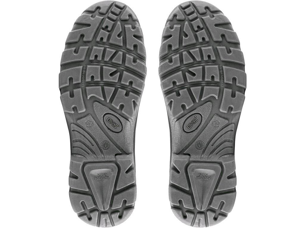 Materiál: svršek z 1,6 - 1,8 mm hydrofobní štípenkové nubukové kůže (z jednoho dílu), vnější TPU ochrana paty, bez kovových součástí, podšívka z prodyšné oděru odolné textilie, podešev: PU-PU olejivzdorná, antistatická, protiskluzová.