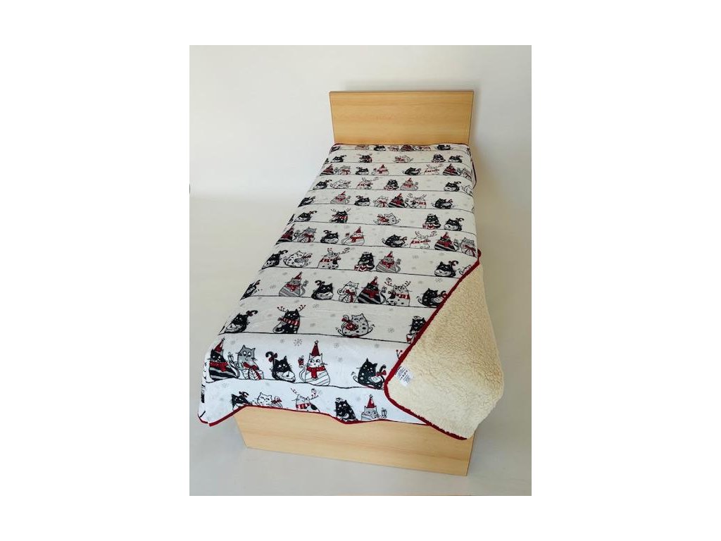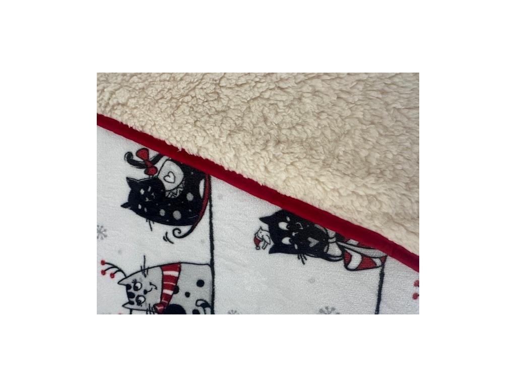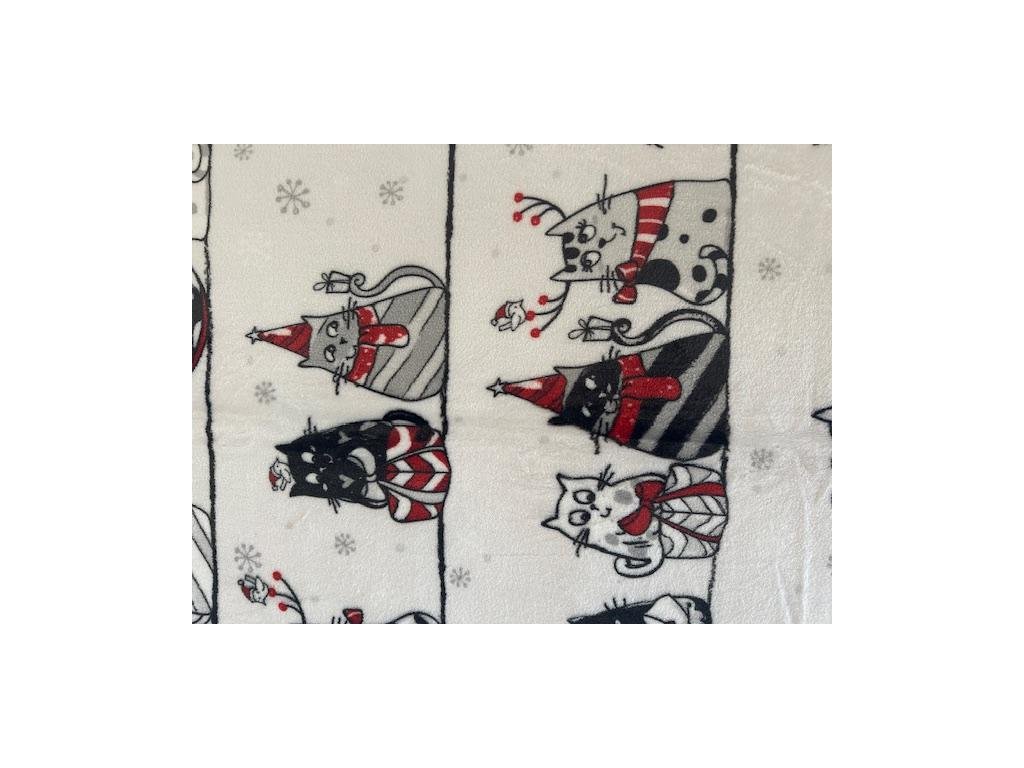 Krásná huňatá deka s potiskem koček laděných do zimní nálady, na bílém podkladě jsou černošedé kočky a červenými akcenty.