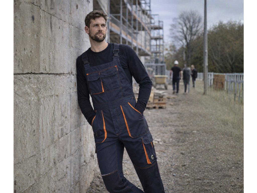 • pánské pracovní vysoce odolné strečové kalhoty s laclem • elastický pas • multifunkční kapsy • 1 velká náprsní kapsa • Oxford 600D zesílení kolenních kapes pro vložení chráničů kolen • tištěné reflexní segmentové detaily • nastavitelná délka nohavic