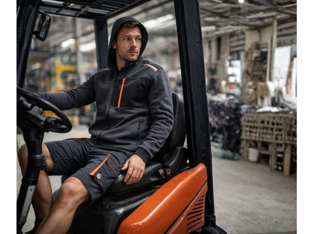 • pánská mikina s kapucí se zapínáním na zip • 2 boční kapsy • 1 náprsní kapsa na zip • zesílená ramena s reflexními pruhy • elastický spodní lem a manžety rukávů