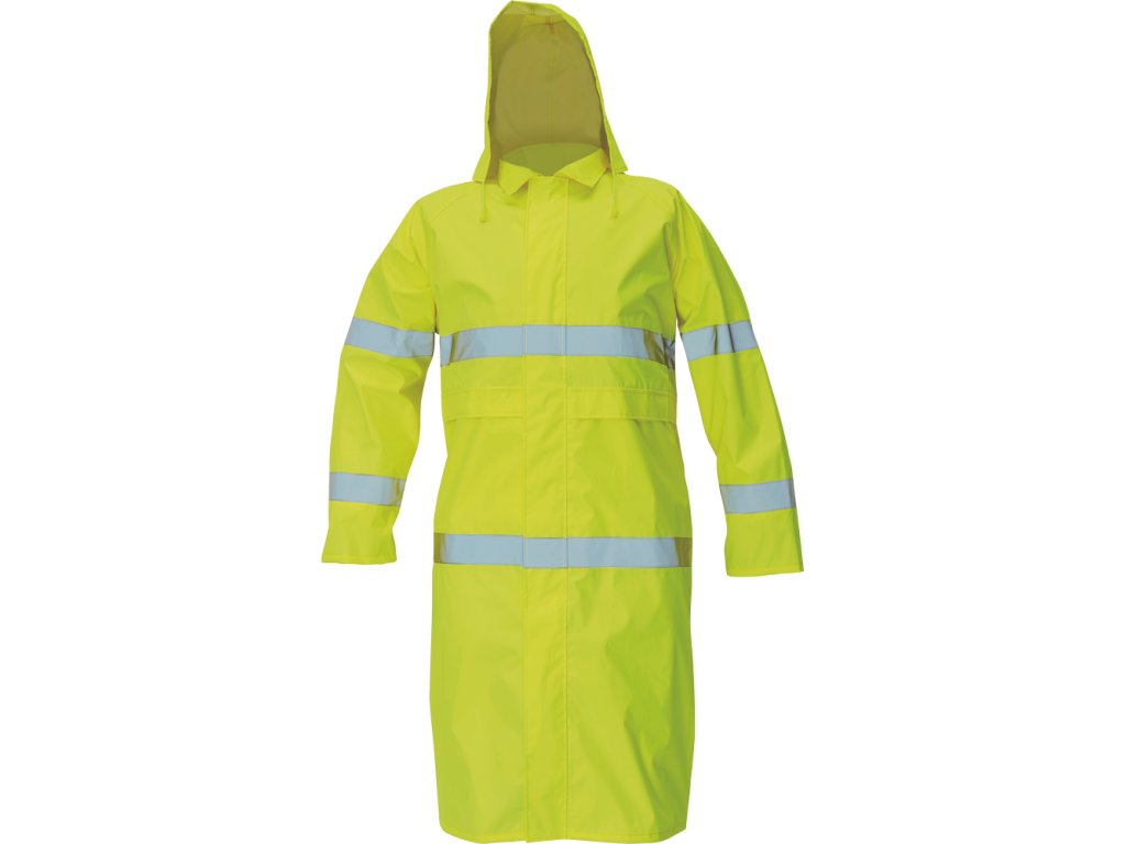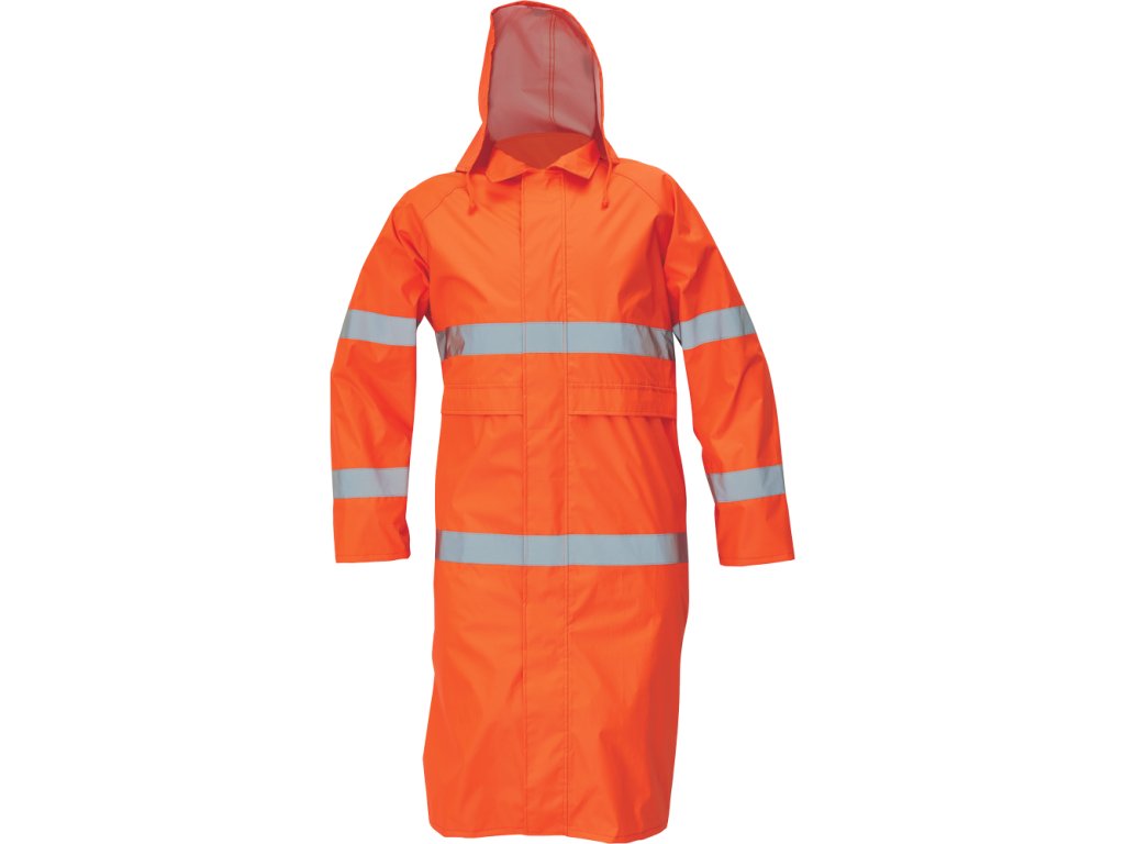 • lehký pánský HI-VIS nepromokavý plášť s kapucí a reflexními pruhy • vysoká voděodolnost, paropropustný • zapínaní na zip kryté légou se suchým zipem • integrovaná kapuce v límci • 2 přední kapsy s klopou • rukávy s vnitřní elastickou manžetou • odvětrávání na zádech a v podpaží • podlepené švy • prodloužená délka 110 cm