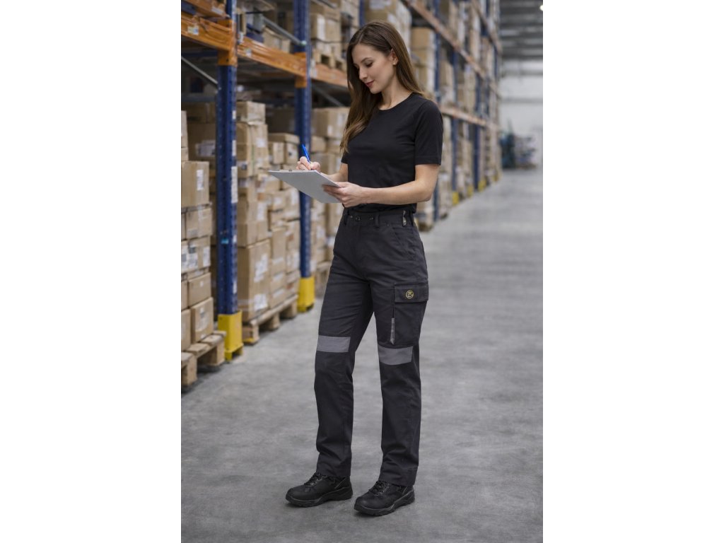 • dámské pracovní kalhoty s elastickým pasem • 2 přední kapsy • 1 levá stehenní kapsa • 2 zadní kapsy se zapínáním na suchý zip • zesílená oblast kolen s možností vložení chráničů kolen • reflexní prvky • nastavitelná délka nohavic