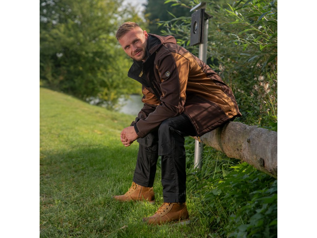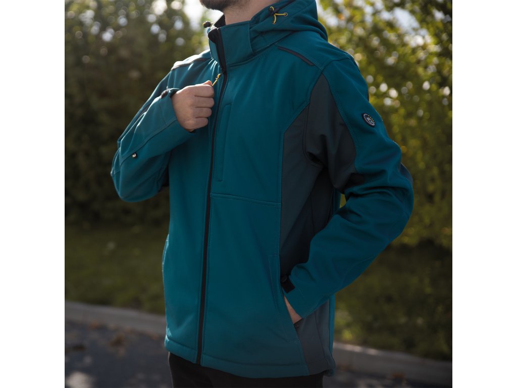 pánská softshellová bunda s odepínací kapucí; 3 přední kapsy na zip, 2 vnitřní kapsy; nastavitelná šíře rukávů plastovým suchým zipem, stahovací pas; reflexní prvky v barevném odstínu.
