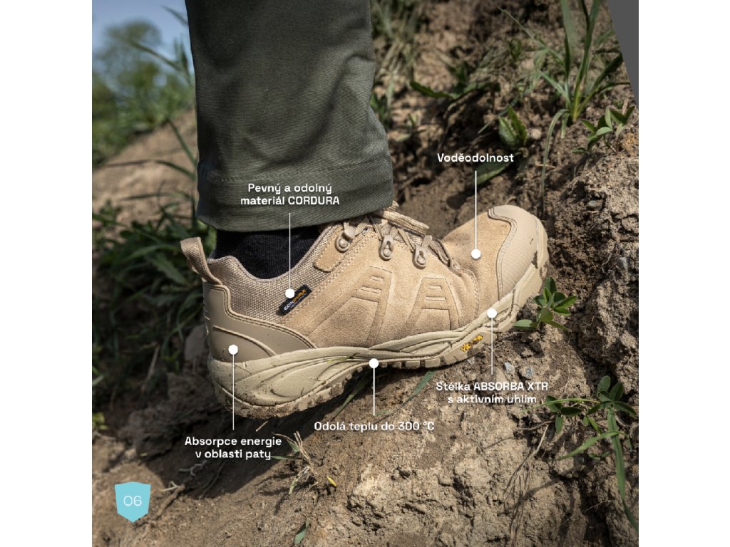 Velmi odolná polobotka bez kovových součástí, vyrobená z hovězinové štípenky a mimořádně pevného Cordura materiálu, který je odolný vůči oděru.