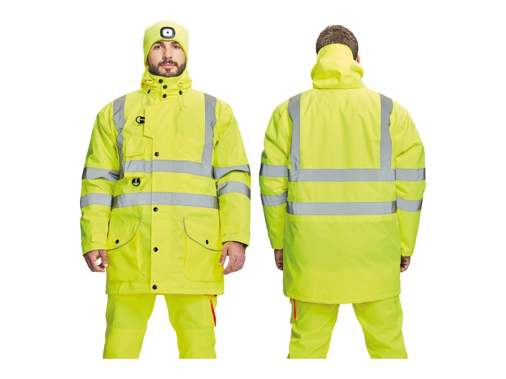 pánská HI-VIS zimní bunda 7 v 1; odepínací svrchní větruodolná a voděodolná bunda s lepenými švy a odepínací kapucí; reflexní pruhy přes ramena, hruď a rukávy; 2 velké přední kapsy, 1 náprsní kapsa; oboustranná samostatná vnitřní bunda s odepínacími rukávy a mnoha multifunkčními kapsami, lze použít jako samostatnou HI-VIS vestu; reflexní pruhy přes ramena, okolo hrudi a boků.